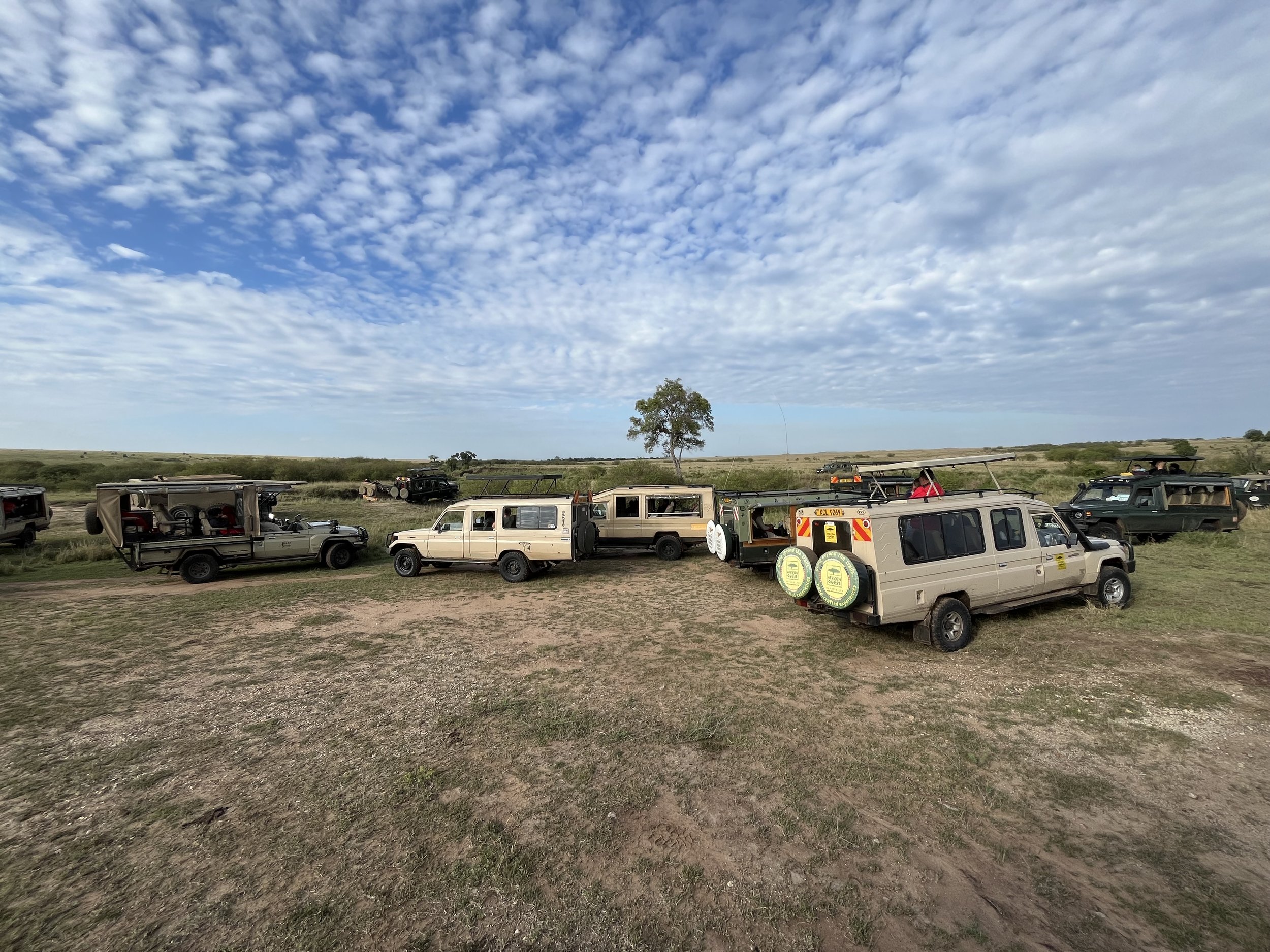 Es dauerte nicht lange, bis die Mara die nächste Überraschung für uns parat hatte. Unsere Fahrer entdeckten eine Warzenschweinfamilie mit zwei Jungen, die durch die Savanne stolzierte. Zusätzlich sahen wir eine Löwin, die tatsächlich zur Jagd ansetzte und eines der Jungtiere erwischte. Die Jagd an sich war deutlich weniger spektakulär als das, was sich um diese Jagd herum abspielte. Wie so oft waren wir nicht das einzige Fahrzeug in der Nähe. Alle Fahrzeuge eilten zum “Kill”, wobei die Löwin die Beute danach noch zu ihren Jungen trug. Jeder Fahrer wollte seinen Fotografenkunden natürlich eine gute Perspektive auf die Szene bieten, was zu einem wilden Fahrzeugballett führte, das ich gerne aus der Luft gesehen hätte. Es ist schier unglaublich, dass es keinen Blechschaden gegeben hat. Dies ist aber der Erfahrung und Koordinationsfähigkeit der Fahrer zu verdanken, die die Bewegungen der Tiere, die der anderen Fahrzeuge und das Gelände im Auge behalten und zeitgleich noch eine gute Sicht für die Fotografen sicherstellen mussten. Als Fotograf kann man sich und seine Ausrüstung nur gut festhalten und über dieses fahrerische Können staunen. Innerhalb kürzester Zeit wird man Augenzeuge einer unheimlichen Dynamik und wundert sich, dass man am Ende mit der Kamera in der ersten Reihe steht.