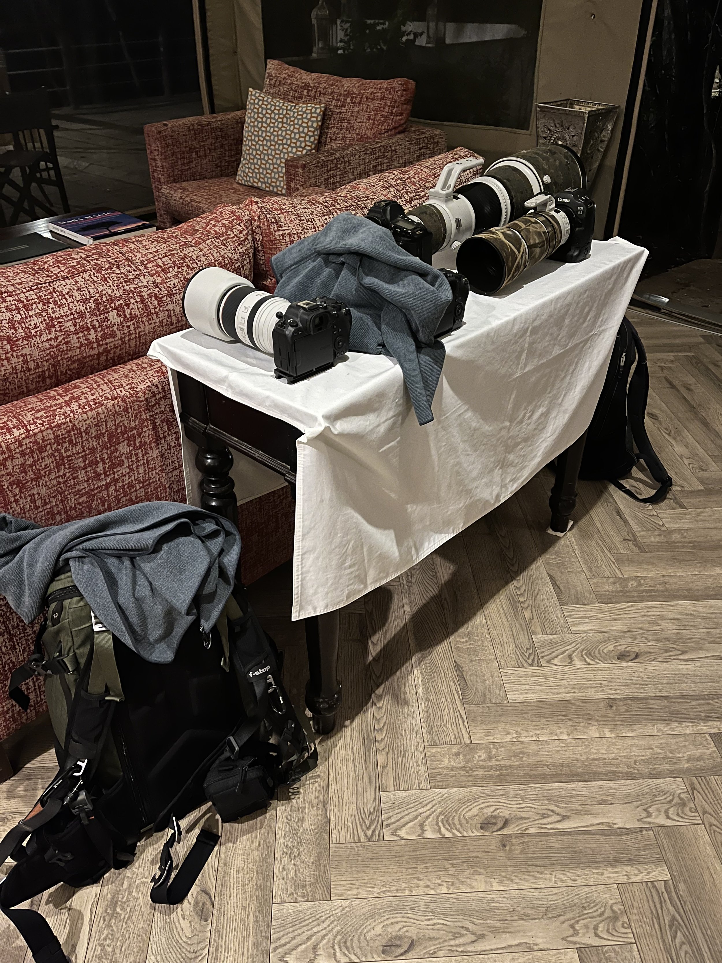 Morgens um 05:30 Uhr im Olive Bush Camp. Die Kameras warten darauf, dass es losgeht.
