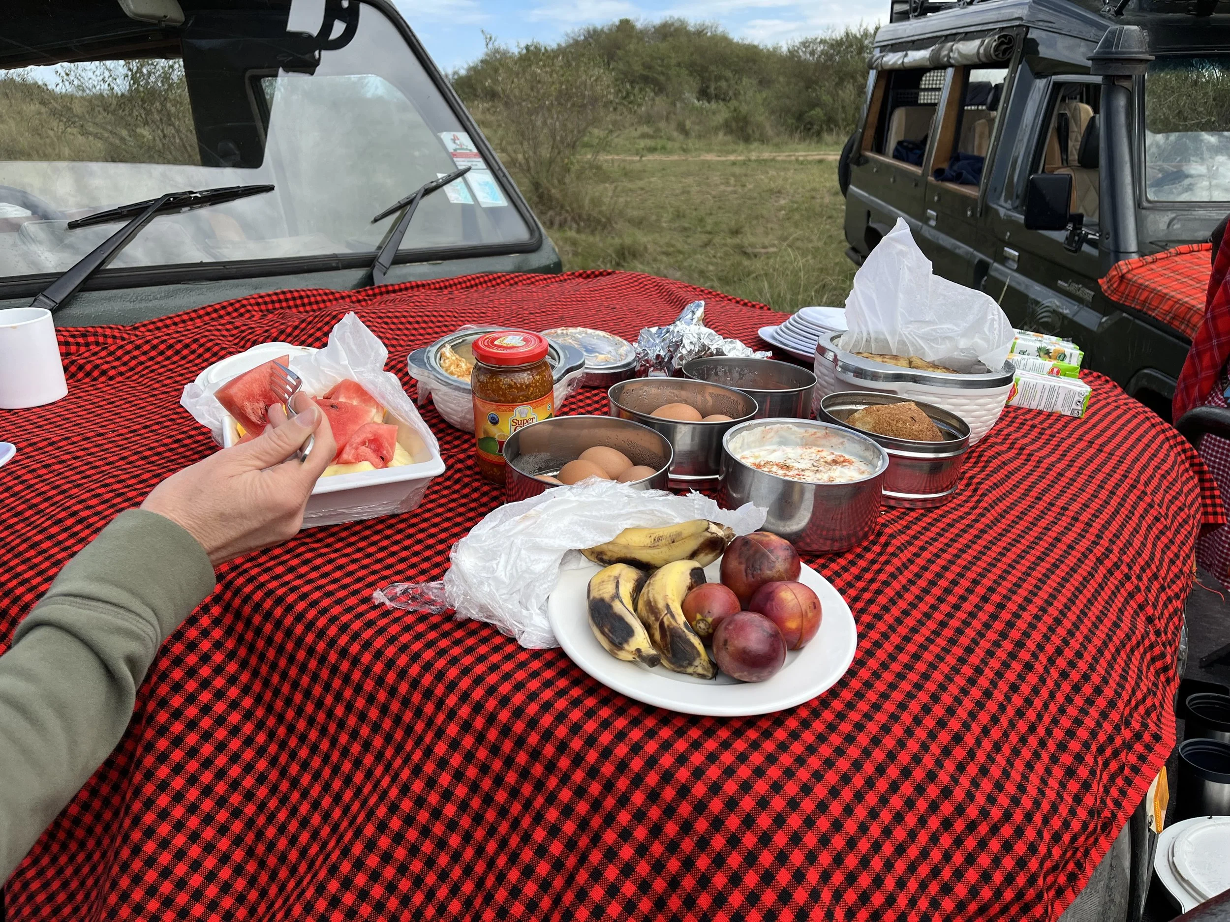 Der reich gedeckte Frühstückstisch - stilsicher mit Masai-Decke auf der Motorhaube.