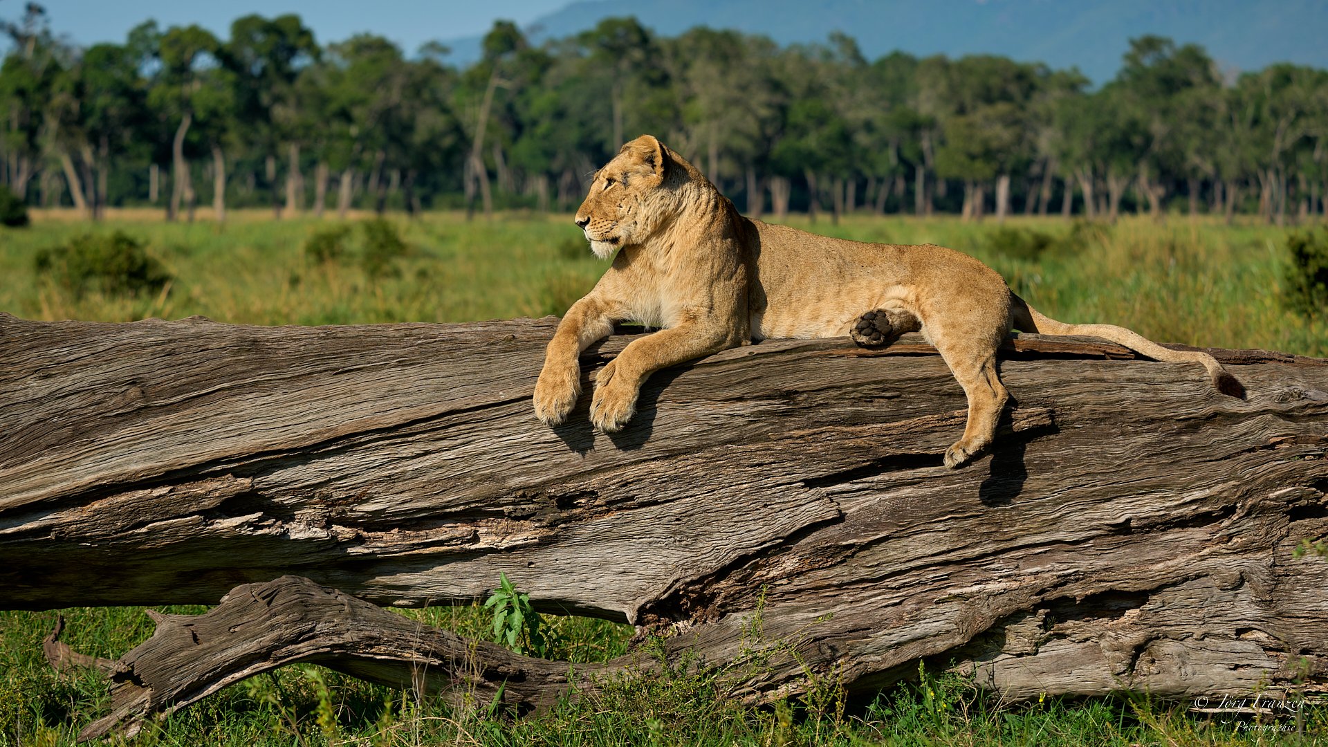 Wenig später sollte es noch besser werden. Wir trafen auf eine Löwin mit ihren beiden etwa 3-4 Wochen alten Jungtieren. Diese konnten sich bei Bedarf in einem hohlen Baumstamm verstecken. Leider machten die beiden davon viel zu schnell Gebrauch, aber es reichte für ein paar Fotos.