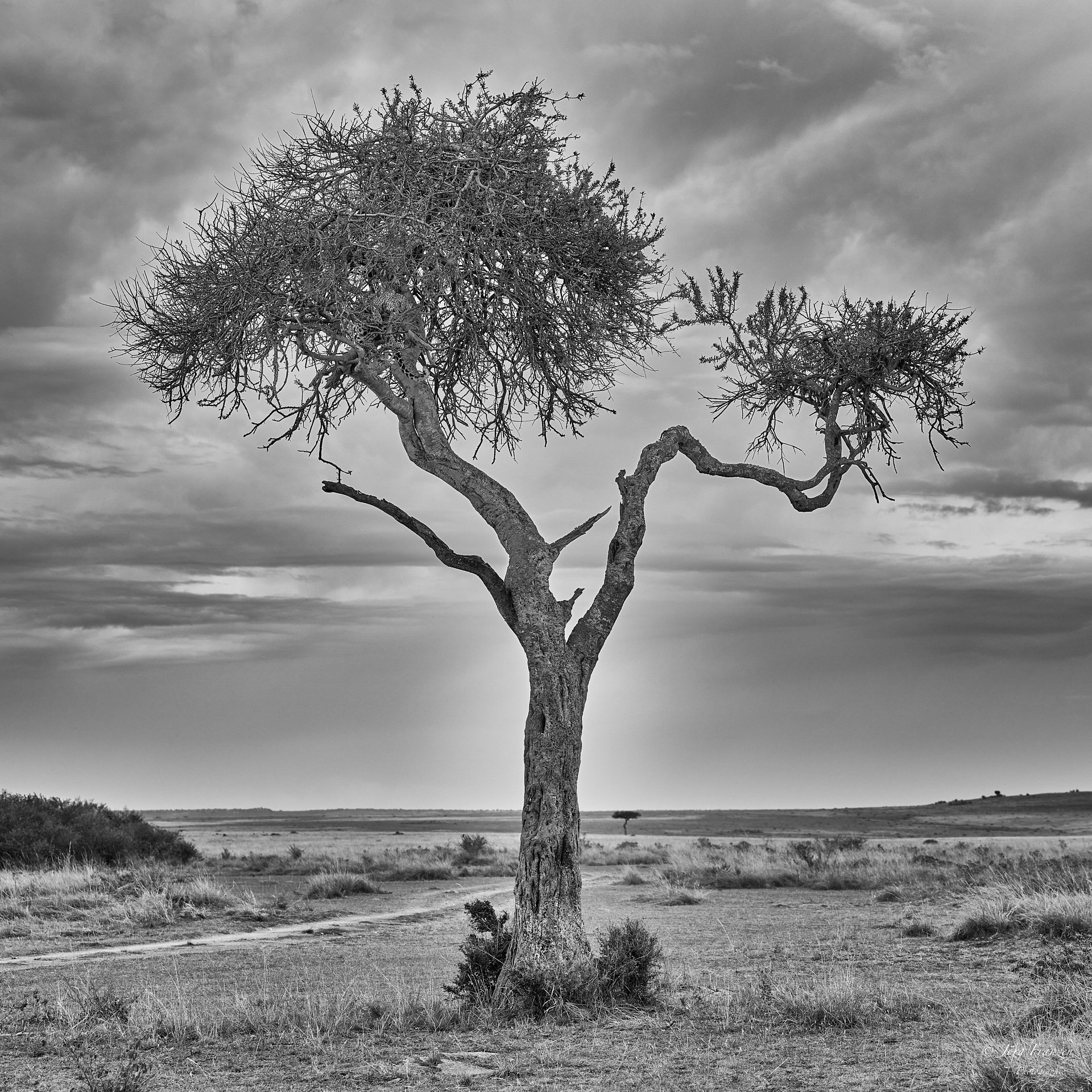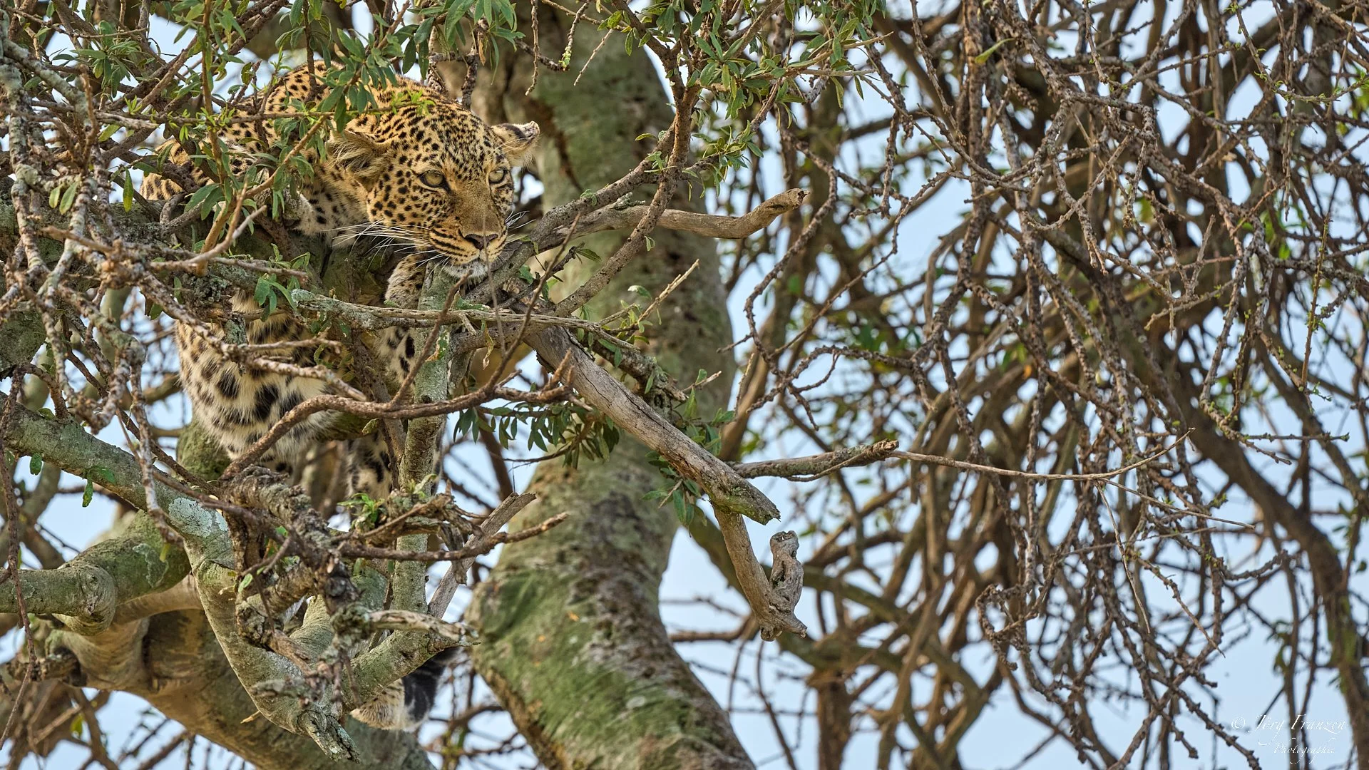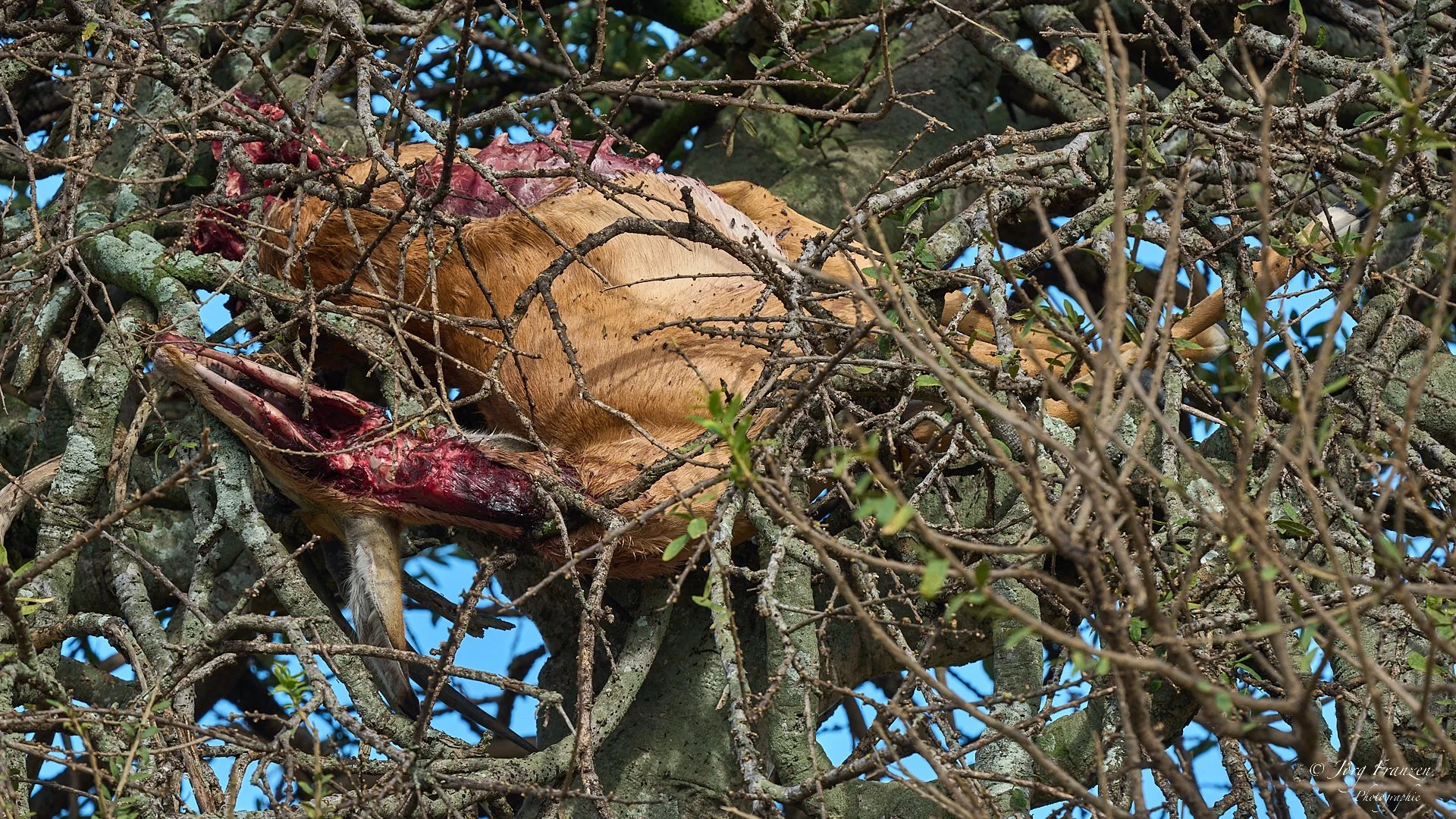 Den Nachmittag verbrachten wir am Baum mit dem Leoparden, der mittlerweile wieder zu seiner Beute hinaufgestiegen war. Viele harrten aus und hofften auf weitere Interaktion. Das zugehörige Leopardenjungtier saß irgendwo unweit im Gebüsch. Erst als es viel zu dunkel zum Fotografieren war, stürmte es auf den Baum.
