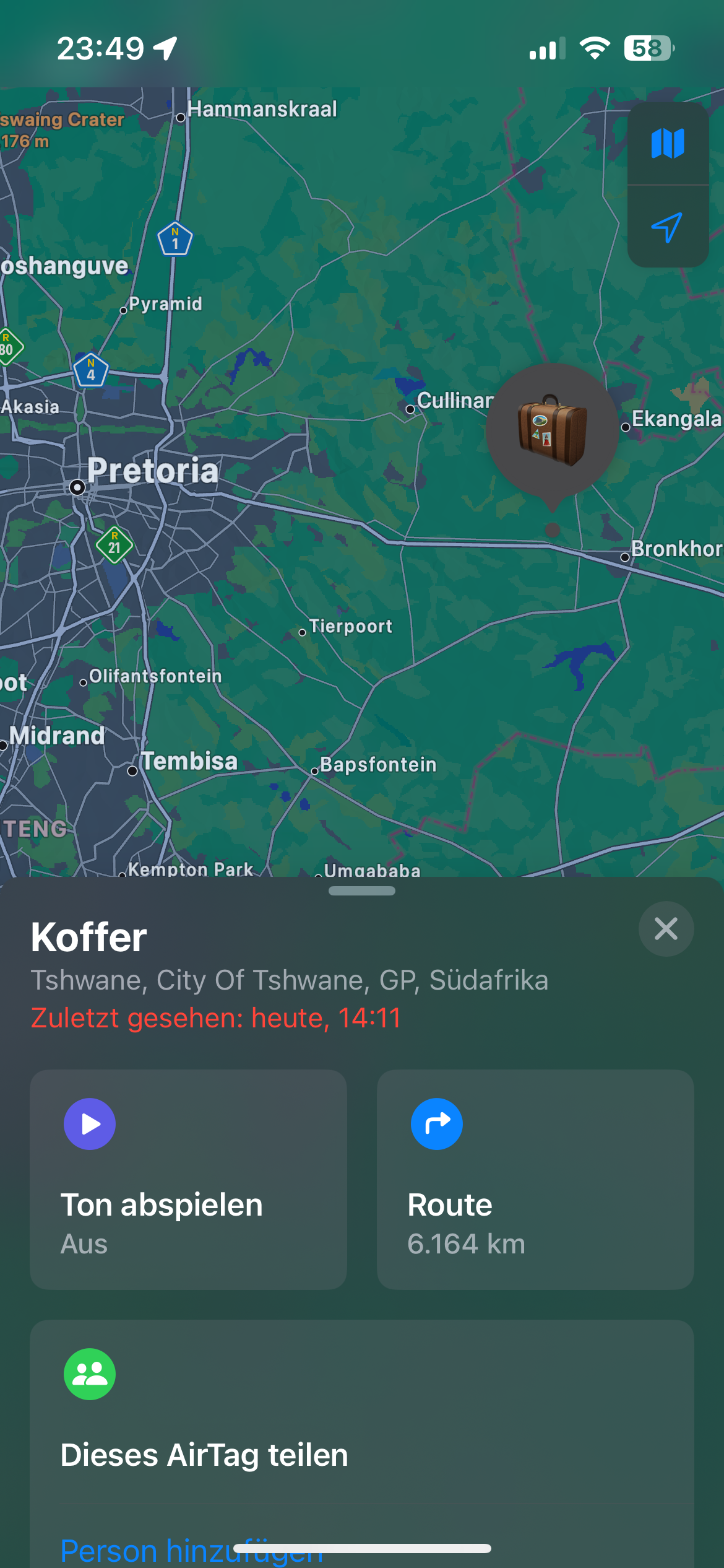 Wenig später tauchte auch mein Koffer in der Karte am Flughafen von Doha auf. Offenbar hatte irgendein iPhone-Nutzer im Flieger nach Doha einen Internetzugang, sein iPhone ortete den AirTag im Laderaum über Pretoria und gab die Position an das “Wo ist?”-Netzwerk weiter. Anders ist dieser Vorfall kaum zu erklären. Jedenfalls war ich heilfroh, dass auch mein Koffer Johannesburg entronnen war.