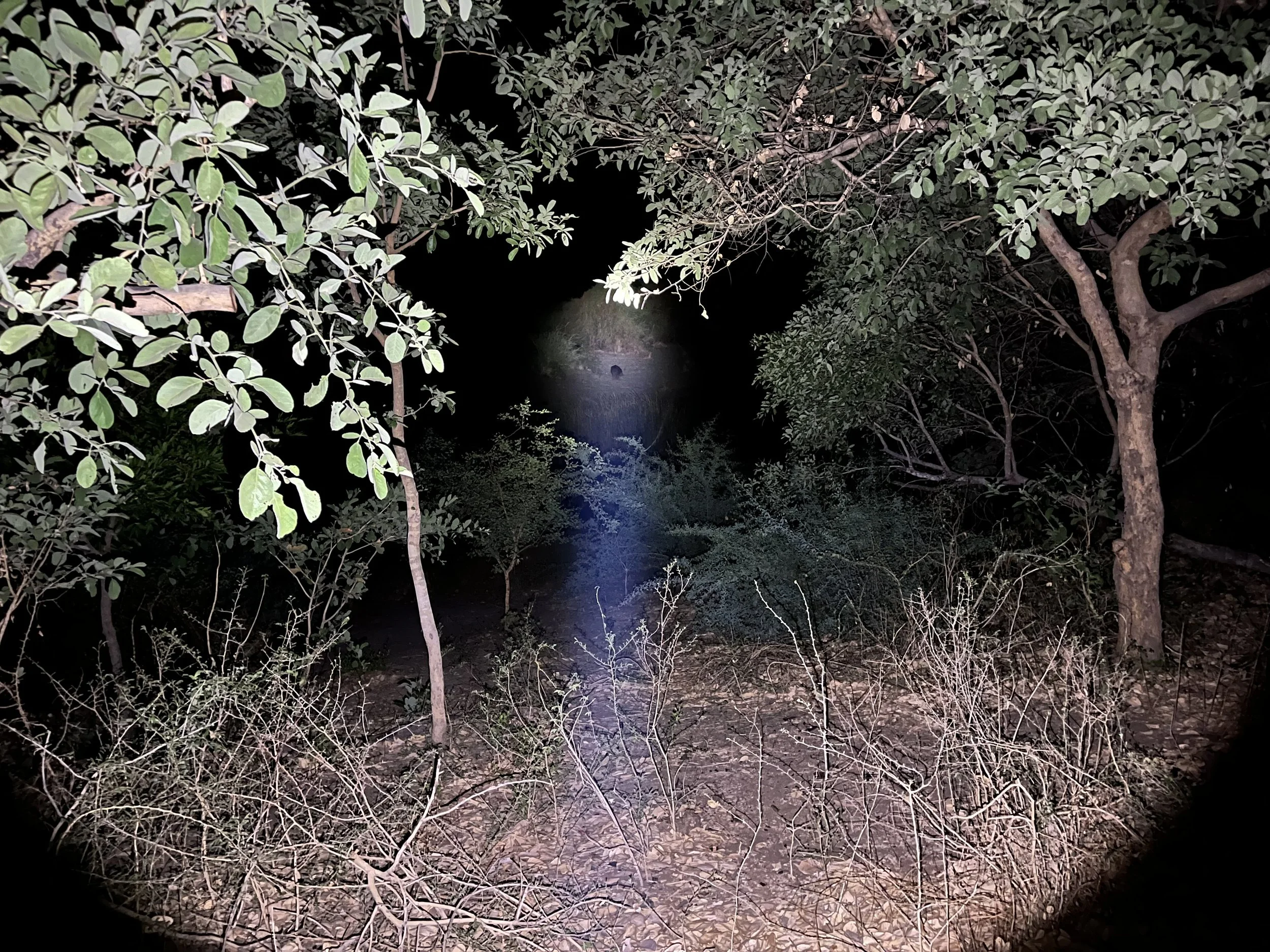 Vor dem Schlafengehen habe ich die Umgebung noch einmal mit einer starken Taschenlampe abgeleuchtet. Auf der anderen Seite des Tümpels in der Nähe unseres Stellplatzes war tatsächlich ein Flusspferd im Lichtkegel zu sehen. Ansonsten hörten wir sie während unseres Aufenthalts nur.